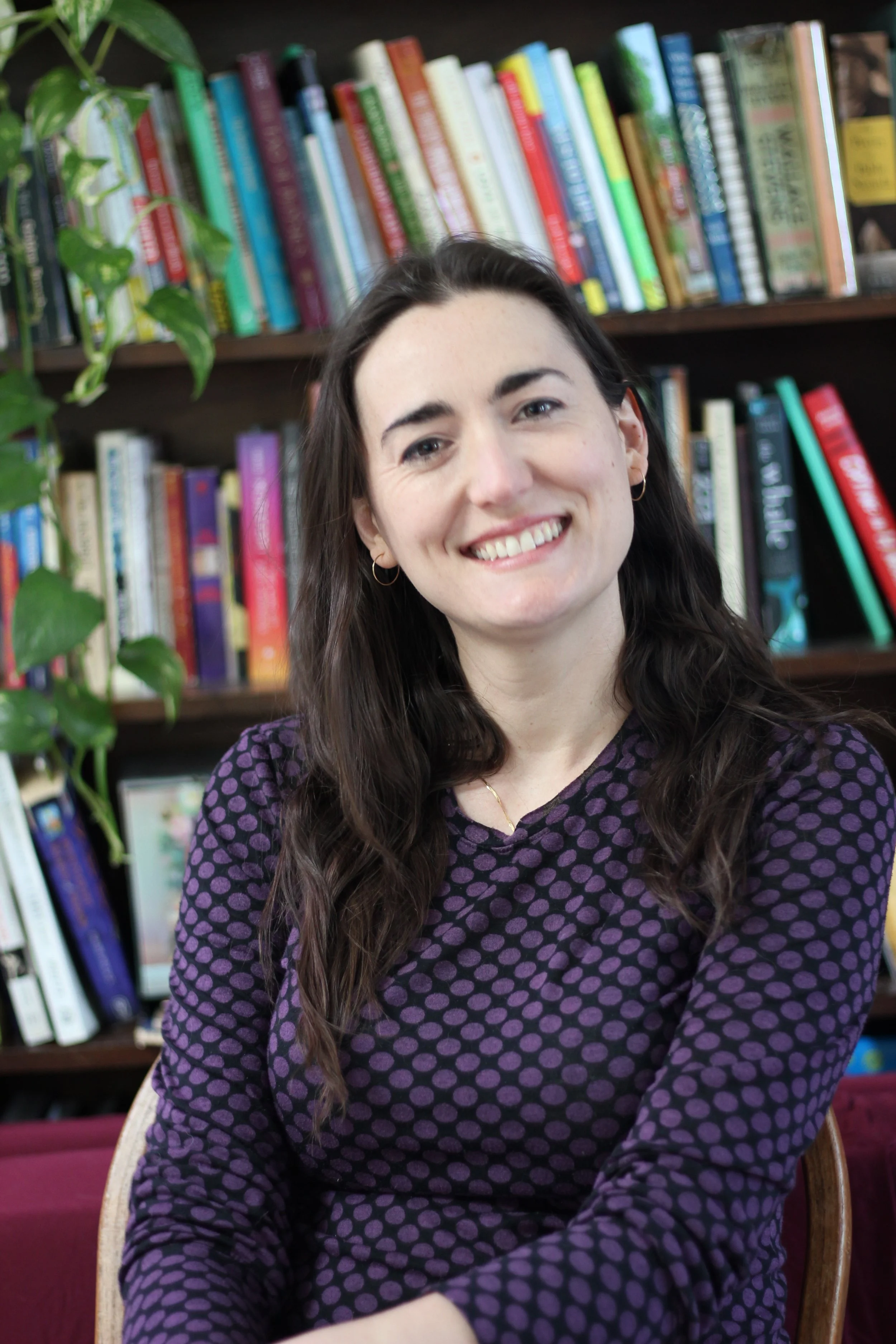 [ID: a white femme sits on a chair in front of a bookcase. The book titles are not in focus and cannot be read. She has long brown hair and wears a purple polka dot shirt, gold earrings and a big smile.]